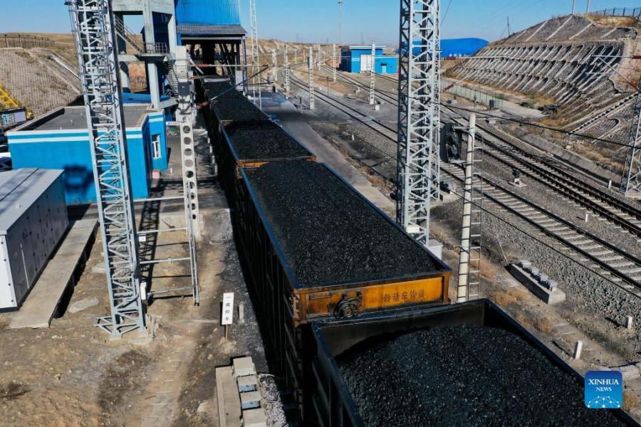 Aerial photo taken on Nov. 23, 2021 shows a train being loaded at a loading station of a coal mine in Erdos, north China's Inner Mongolia Autonomous Region. North China's Inner Mongolia Autonomous Region has made enormous efforts to ensure the supply of coal across the country, as coal consumption saw a surge in early winter. China Railway Hohhot Group Co., Ltd. has also been mobilized in various ways to ensure the transportation of coal for power generation and heating this winter and next spring. (Xinhua/Li Zhipeng)