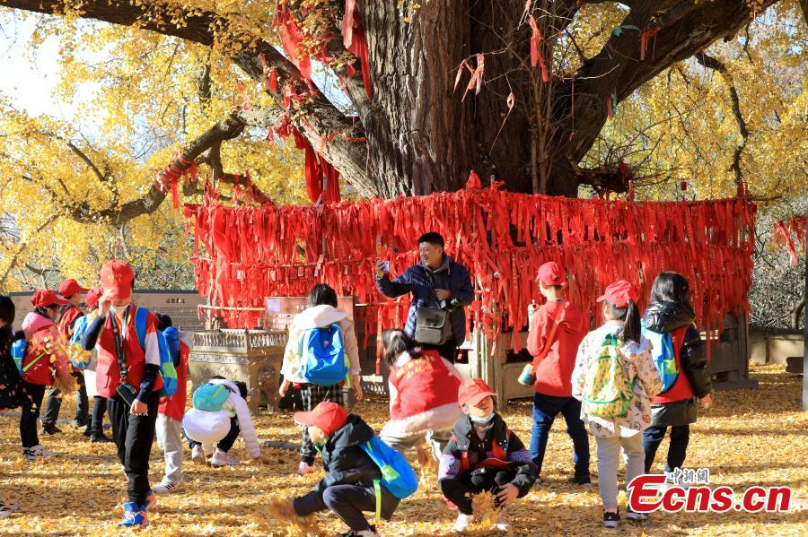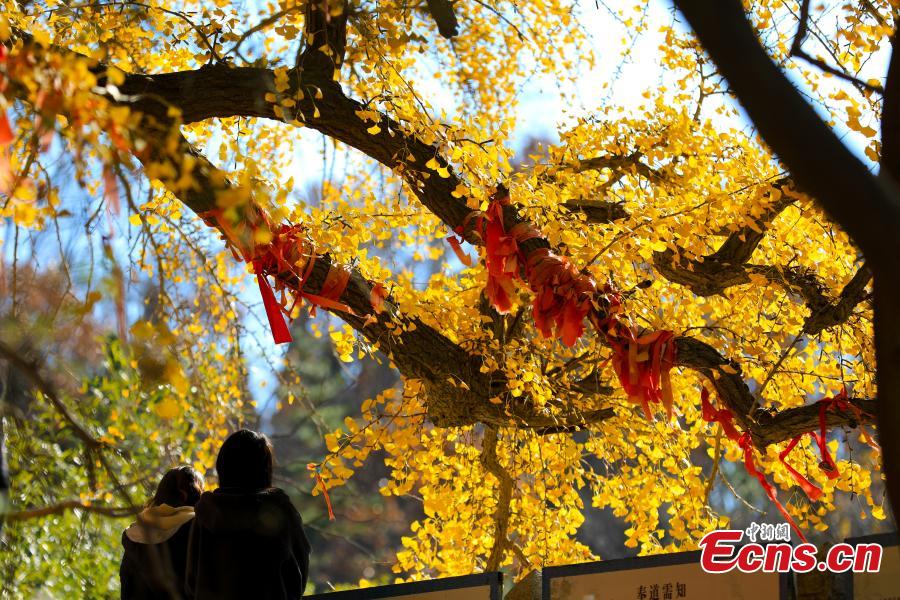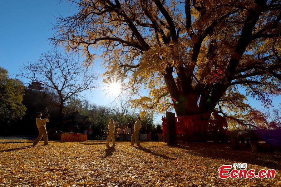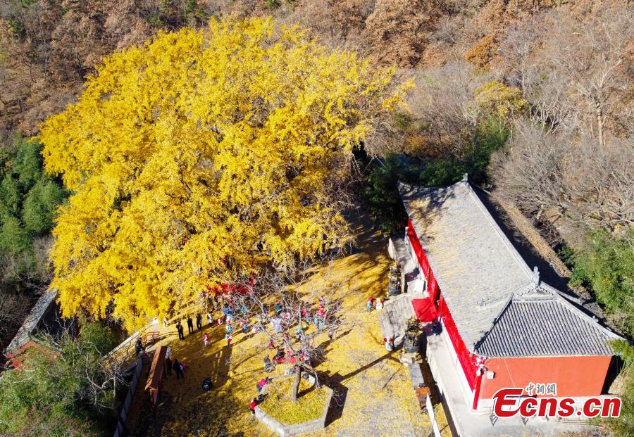 A ginkgo tree of around 1,000 years old enters its best season in Rongcheng City, east China's Shandong Province, Nov. 27, 2021. Under the first-level state protection in China, the ancient ginkgo tree is rare hermaphroditic. (Photo: China News Service/Lin Haizhen)