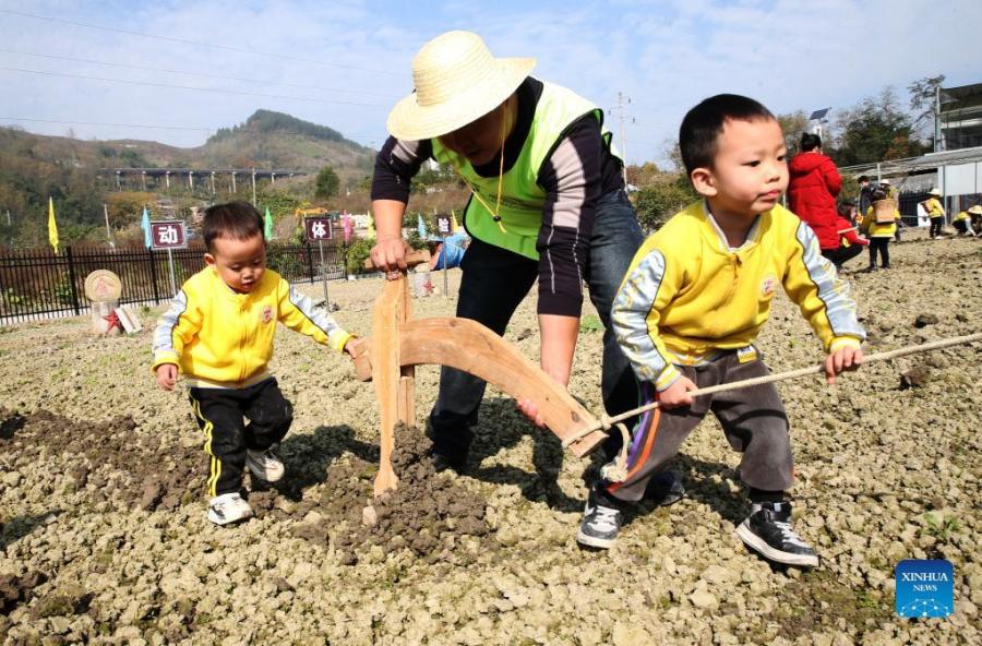 Photo taken on Nov. 27, 2021 shows children tilling the soil at Zhaizi Farming Experience Centre in Qianjiang District, southwest China's Chongqing Municipality. Qianjiang District established the farming experience centre to attract more children to the countryside, so that they can gain a practical understanding of farm labour and learn about crops and the history of agriculture.(Xinhua/Yang Min)