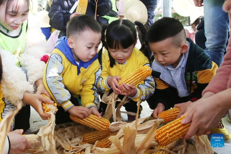 Photo taken on Nov. 27, 2021 shows children threshing corn by hand at Zhaizi Farming Experience Centre in Qianjiang, southwest China's Chongqing Municipality. Qianjiang District established the farming experience centre to attract more children to the countryside, so that they can gain a practical understanding of farm labour and learn about crops and the history of agriculture. (Xinhua/Yang Min)