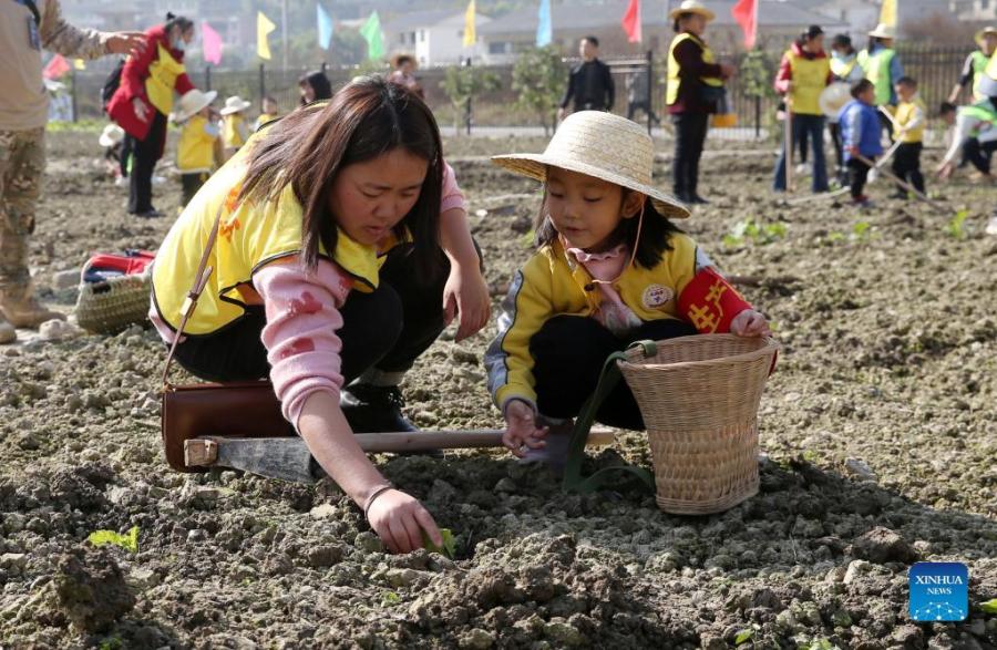 Photo taken on Nov. 27, 2021 shows children planting seedlings with their parents at Zhaizi Farming Experience Centre in Qianjiang, southwest China's Chongqing Municipality. Qianjiang District established the farming experience centre to attract more children to the countryside, so that they can gain a practical understanding of farm labour and learn about crops and the history of agriculture.(Xinhua/Yang Min)