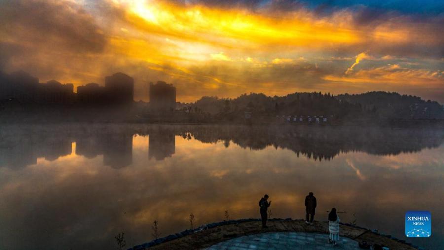 Photo taken on Nov. 25, 2021 shows the sunrise scenery of Lixiang Lake National Wetland Park in Nanchuan District, southwest China's Chongqing Municipality. Local authorities of Nanchuan District have in recent years made all-out efforts to strengthen ecological protection of Lixiang Lake. The endeavor has yielded blue skies and clear waters as well as booming tourism. (Photo by Qu Mingbin/Xinhua)