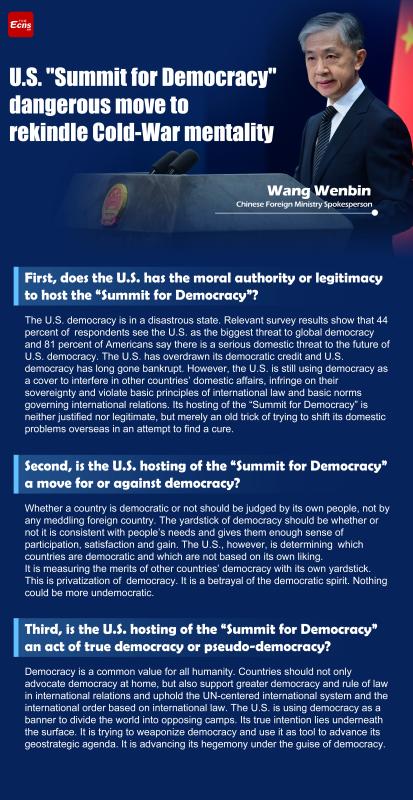 U.S. 'Summit for Democracy' dangerous move to rekindle Cold-War mentality: FM spokesperson