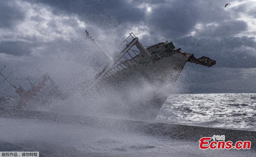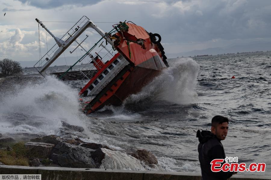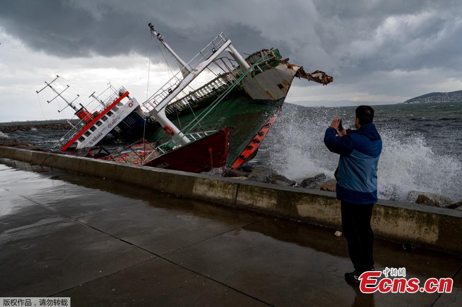 A passer-by takes a picture of a boat which has capsized due to strong winds in Istanbul on Nov. 30, 2021. (Photo/Agencies)