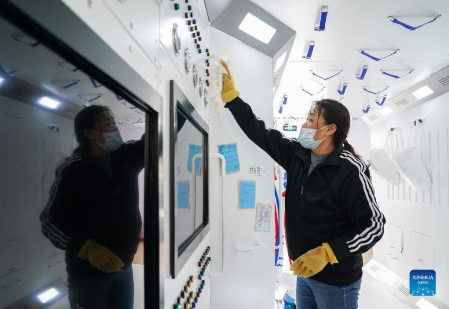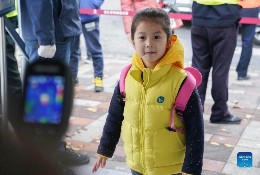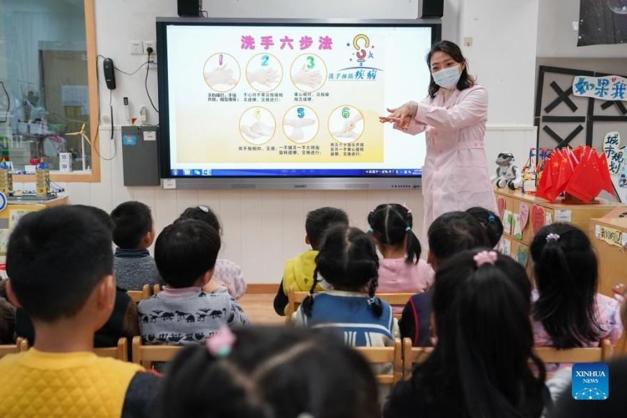 A kindergarten in Xuhui District of east China's Shanghai teaches children campus disinfection, preparedness and other epidemic prevention measures, in order to improve health and hygiene and build a strong epidemic defense. (Xinhua/Ding Ting)