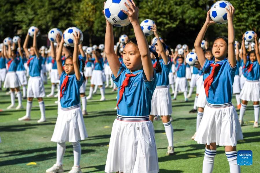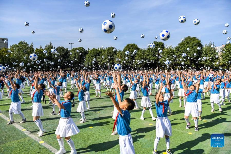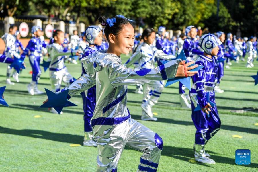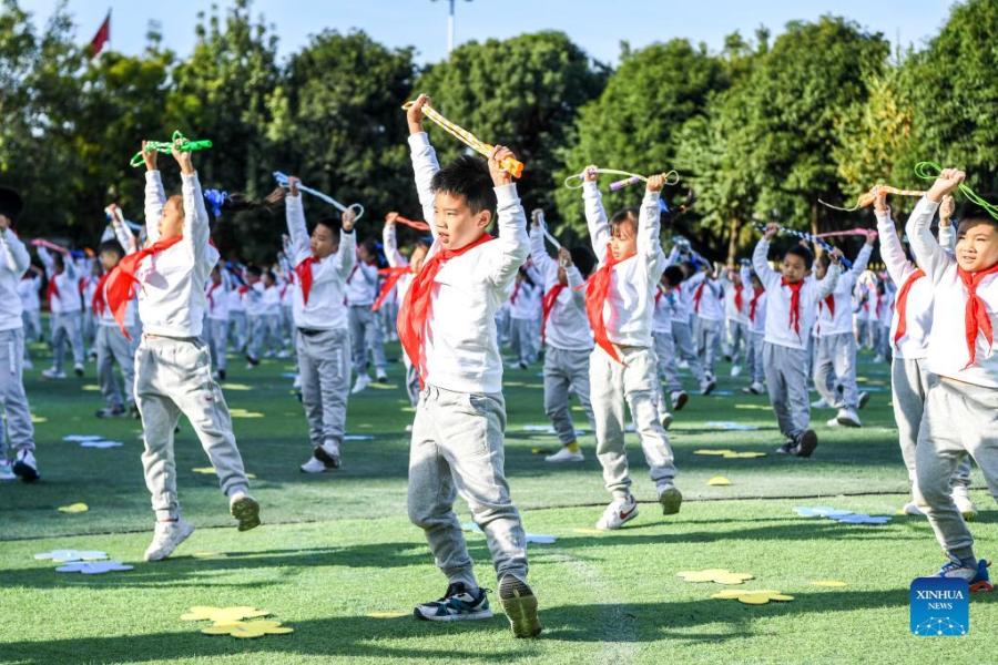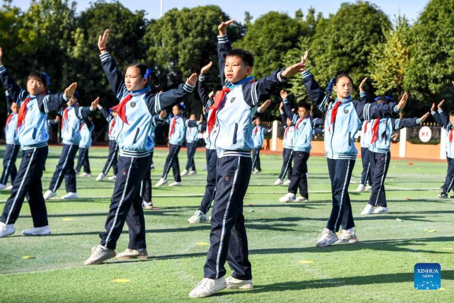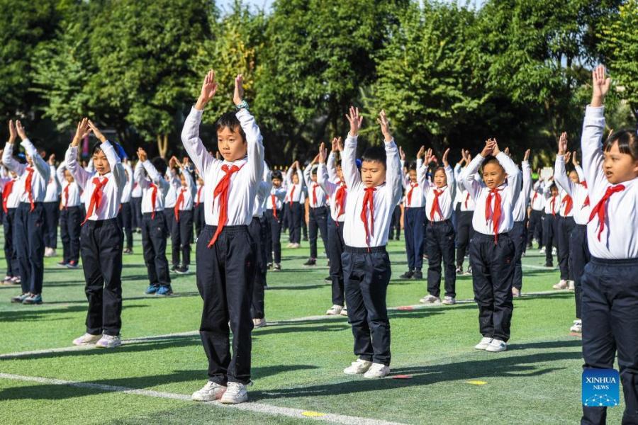Photo taken on Dec. 1, 2021 shows children performing group calisthenics in Binhu Road Primary School in Nanning, south China's Guangxi Zhuang Autonomous Region. On Dec. 1, the Binhu Road Primary School held the opening ceremony of "sports culture festival". A number of activities were held for the festival, such as group calisthenics performances and sports competitions. This allows the children to get out of the classroom, enjoy the sunshine, and partake in the joy of sports. (Xinhua/Cao Yiming)