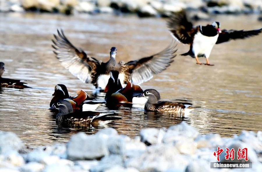 A group of wild mandarin ducks plays at Qinglilang River National Wetland Park in Xiangyang City, central China's Hubei Province, Dec. 4, 2021. (Photo: China News Service/Wang Zhuang)