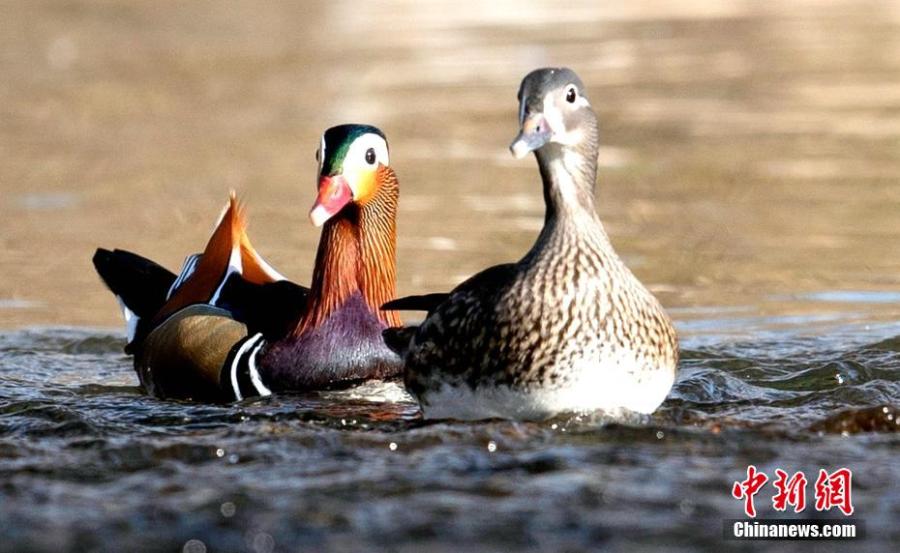 A pair of wild mandarin ducks swim in the water at Qinglilang River National Wetland Park in Xiangyang City, central China's Hubei Province, Dec. 4, 2021. (Photo: China News Service/Wang Zhuang)