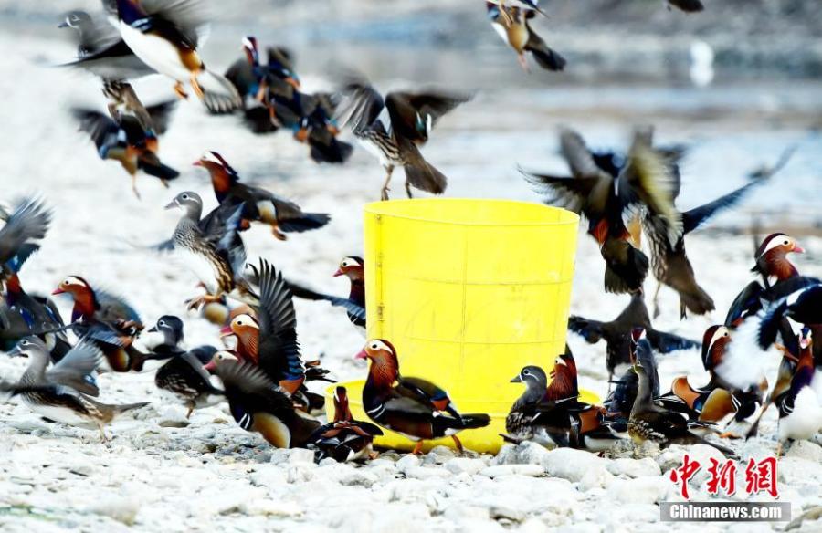 Wild mandarin ducks and farm-raised ducks share food provided by villagers at Qinglilang River National Wetland Park in Xiangyang City, central China's Hubei Province, Dec. 4, 2021. (Photo: China News Service/Xiong Mingyin)