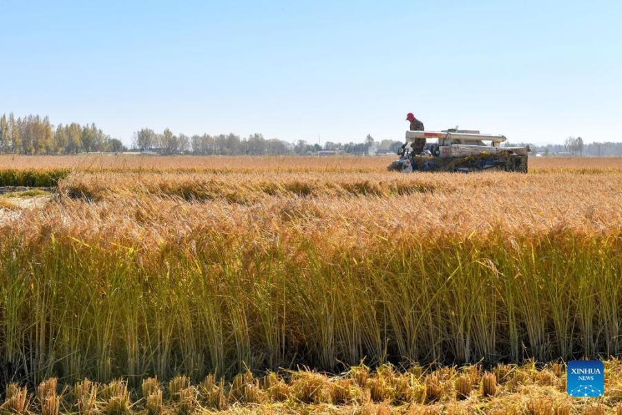 Photo taken on Oct. 12, 2021 shows a farmer harvesting rice in Yongji County of Jilin City, northeast China's Jilin Province. Jilin recorded a bumper grain harvest, with the total grain output reaching 40.39 million tonnes this year, up more than 2.36 million tonnes year on year, according to data released by the National Bureau of Statistics. (Xinhua/Zhang Nan)