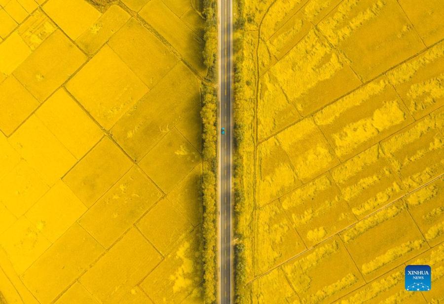 Aerial photo taken on Oct. 1, 2021 shows a view of the paddy fields in Yongji County of Jilin City, northeast China's Jilin Province. Jilin recorded a bumper grain harvest, with the total grain output reaching 40.39 million tonnes this year, up more than 2.36 million tonnes year on year, according to data released by the National Bureau of Statistics. (Xinhua/Xu Chang)