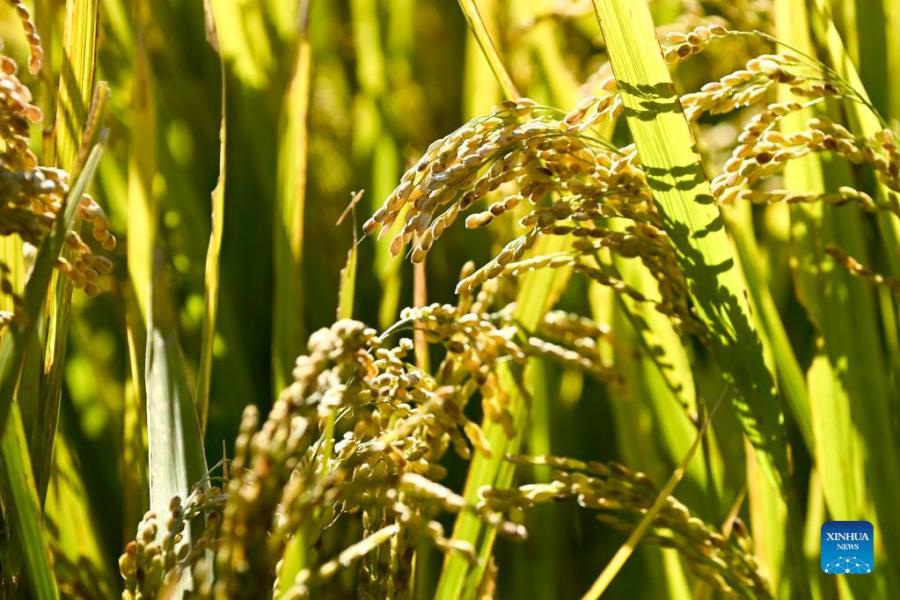 Photo taken on Oct. 11, 2021 shows ripe rice in Guangdong Village of Yanbian Korean Autonomous Prefecture, northeast China's Jilin Province. Jilin recorded a bumper grain harvest, with the total grain output reaching 40.39 million tonnes this year, up more than 2.36 million tonnes year on year, according to data released by the National Bureau of Statistics. (Xinhua/Yan Linyun)