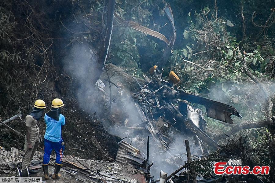 Rescue workers search through the debris of an Indian Air Force Mi-17V5 helicopter crash site in Coonoor, Nilgiris district, Tamil Nadu, India, Dec. 8, 2021. (Photo/Agencies)
