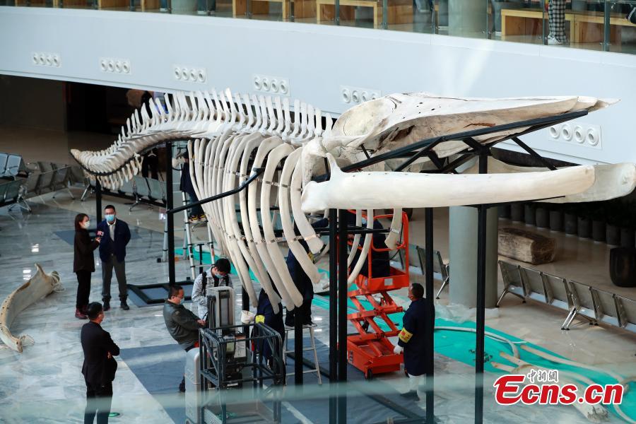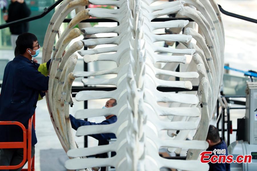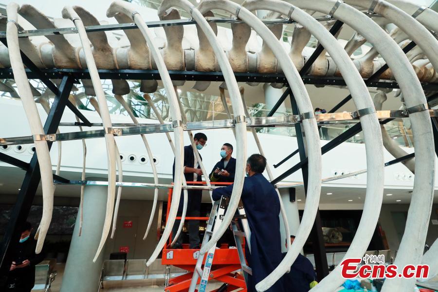 The assembly of China's longest fin whale specimen was completed at the Shanghai Natural History Museum on Thursday. The prototype of the 24-meter-long specimen was the dead fin whale found at the junction of the Yangtze River Estuary and Hangzhou Bay in Shanghai on March 2, 2017. It has been stored in the specimen warehouse of the Shanghai Science and Technology Museum since 2017 and was eventually made into a specimen by the museum's taxidermy team.
