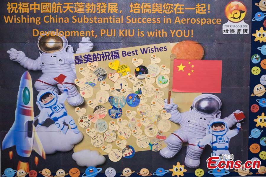 A wall with students' wishes for booming development of China's space industry is seen at Pui Kiu College in Sha Tin, Hong Kong Special Administrative Region, Dec. 9, 2021. (Photo: China News Service/Chen Yongnuo)