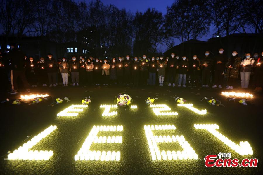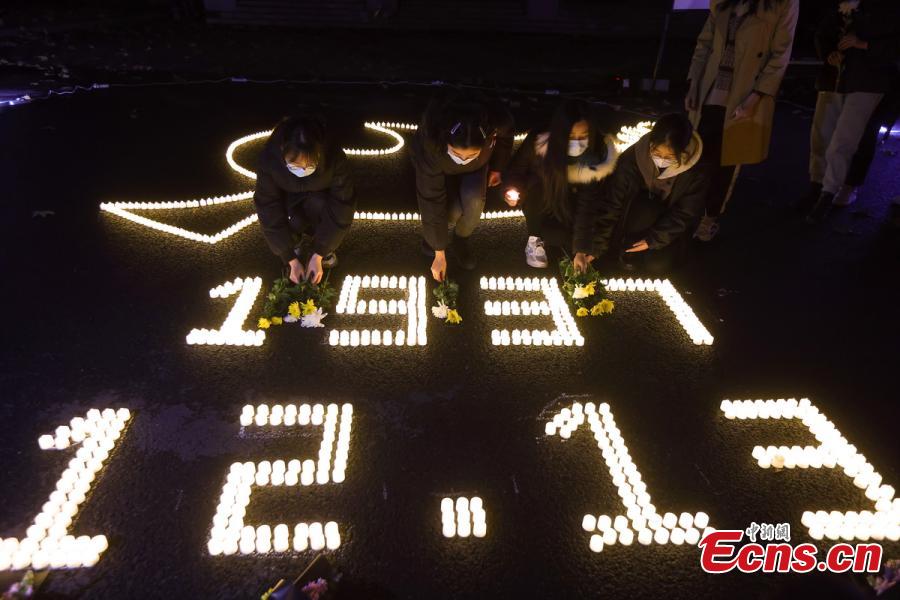 Students of Southeast University light candles for Nanjing Massacre victims on December 12, one day before China's National Memorial Day, in Nanjing, east China's Jiangsu Province.(China News Service/Yang Bo)