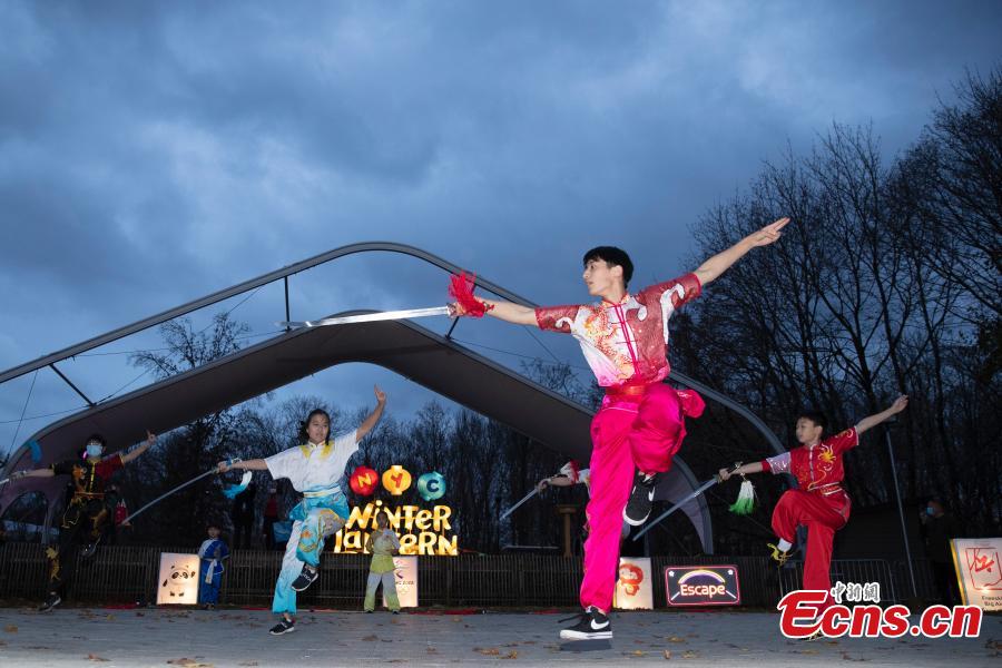 A Winter Olympics-themed Day, featuring a photo exhibition and a lighting ceremony, is held at Snug Harbor Cultural Center & Botanical Garden in New York, Dec. 12, 2021, bringing winter sports pictograms and elements of Beijing Winter Olympics to American citizens. (China News Service/Liao Pan)