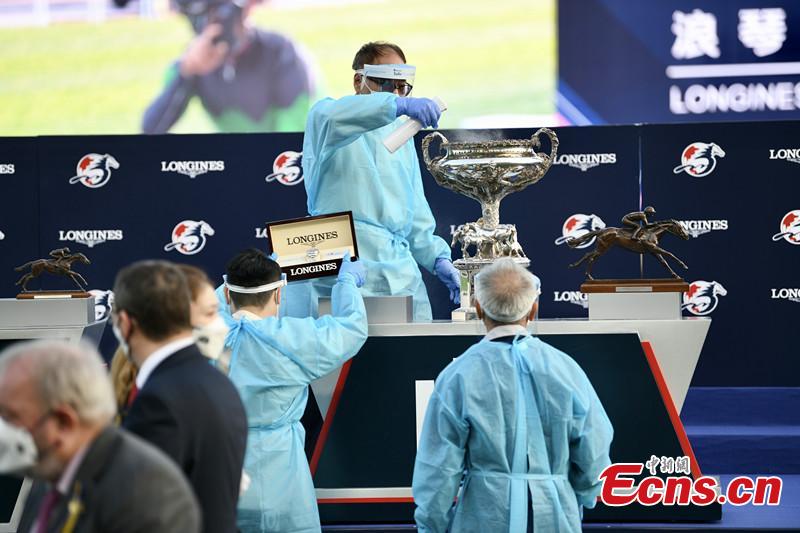 A staff member disinfects the trophy of the 2021 LONGINES Hong Kong International Races to prevent the COVID-19 pandemic, at Sha Tin Racecourse, Dec. 12, 2021. (China News Service/Li Zhihua)