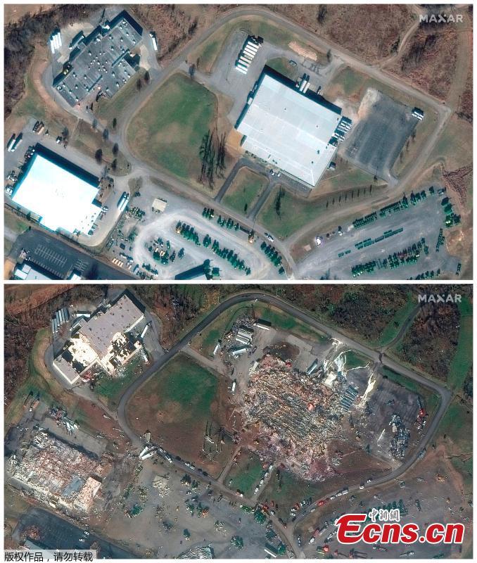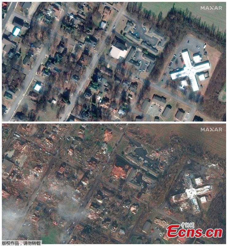 The combination photo taken on Jan. 28, 2017 and Dec. 11, 2021 shows a contrast of the scenery of blocks ripped by a devastating tornado in?Mayfield, Kentucky, U.S. (Photo/Agencies)