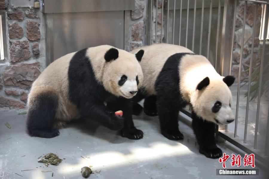 A pair of giant pandas stroll at their new cage at the Chengdu Research Base of Giant Panda, China’s Sichuan Province, Dec 13, 2021. (Photo/IC)