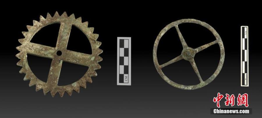 The photo captured on May 7, 2020 shows the copper gears and copper components unearthed from the large tomb that is confirmed to be the real Baling mausoleum of Emperor Wendi in Western Han Dynasty at Jiangcun Village in Xi'an City, northwest China's Shaanxi Province. (Photo provided by Shaanxi Provincial Institute of Archaeology)
