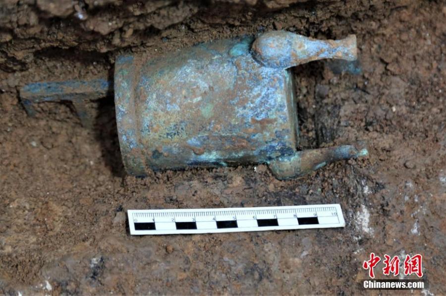 The photo taken on Sept. 11, 2018 shows the cooper kettle clepsydra excavated from the large tomb that is confirmed to be the real Baling mausoleum of Emperor Wendi in Western Han Dynasty at Jiangcun Village in Xi'an City, northwest China's Shaanxi Province. (Photo provided by Shaanxi Provincial Institute of Archaeology)