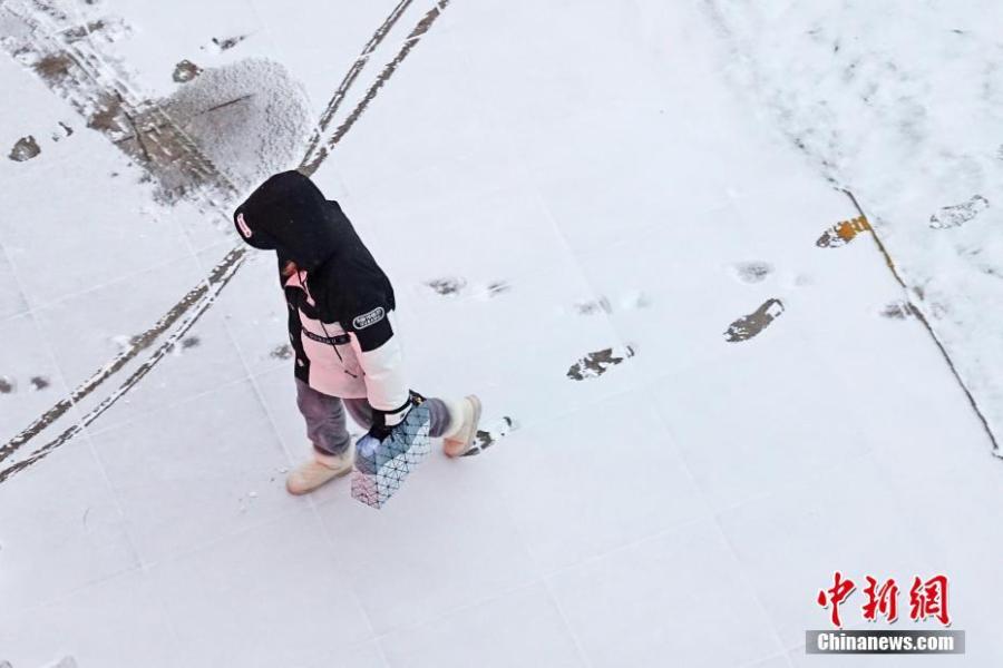 Photo shows a woman walking slowly on a snow-covered street in Dalian, northeast China's Liaoning Province, Dec. 17, 2021. China on Friday renewed a blue alert for a cold wave, forecasting low temperatures and gales in vast regions of the country. (Photo/ICphoto)
