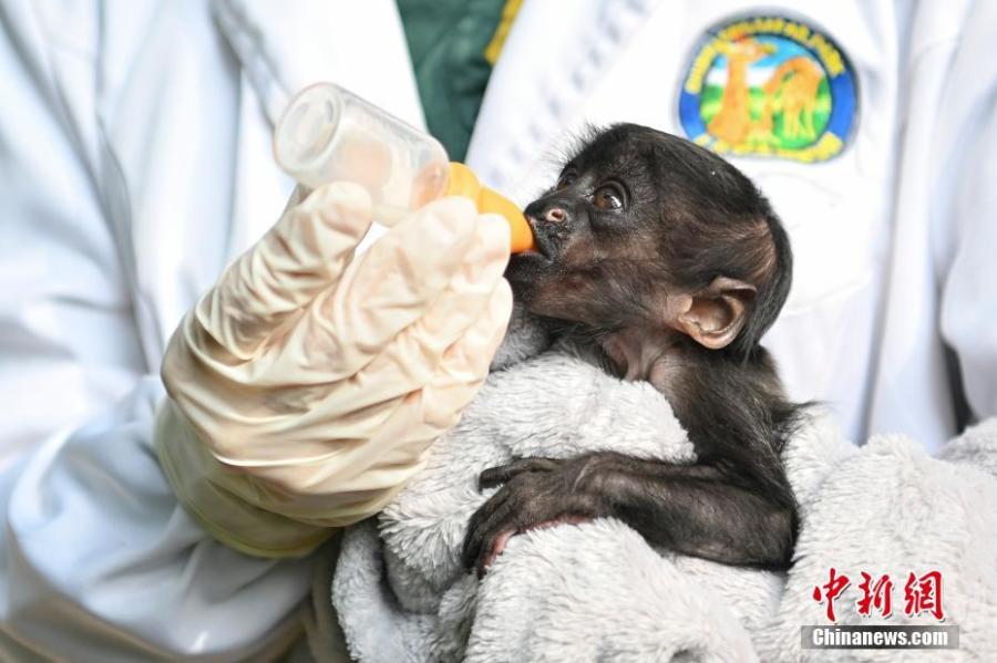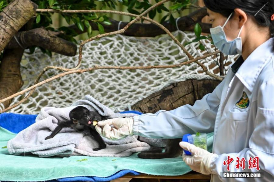 Photo shows a staff feeding black bearded saki cub Congcong, Dec. 16, 2021 in Guangzhou, south China's Guangdong Province. Congcong, a male black bearded saki cub born on July 22, 2021, meets the public at Chimelong Safari Park in Guangzhou, capital of south China's Guangdong Province, Dec. 16, 2021. (Photo/China News Service)