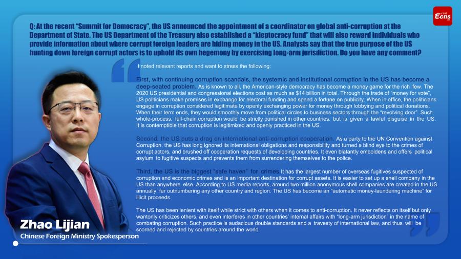 Chinese FM slammed the US for long-arm jurisdiction under the banner of anti-corruption on Wednesday, calling the US the biggest "safe haven" for overseas fugitives.