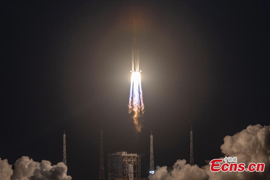 A Long March-7A rocket carrying Shiyan-12 01 and Shiyan-12 02 satellites blasts off from the Wenchang Spacecraft Launch Site in south China's Hainan Province, Dec. 23, 2021. (Photo: China News Service/Luo Yunfei)