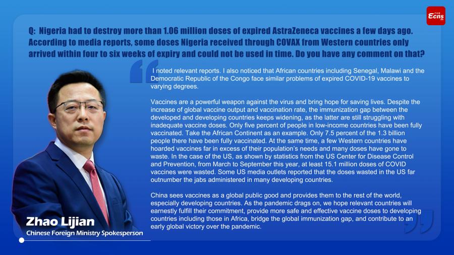 A Foreign Ministry spokesperson Monday said that relevant countries should fulfill their commitment, provide more safe and effective vaccine doses to developing countries, bridge the global immunization gap, and contribute to an early global victory over the pandemic.