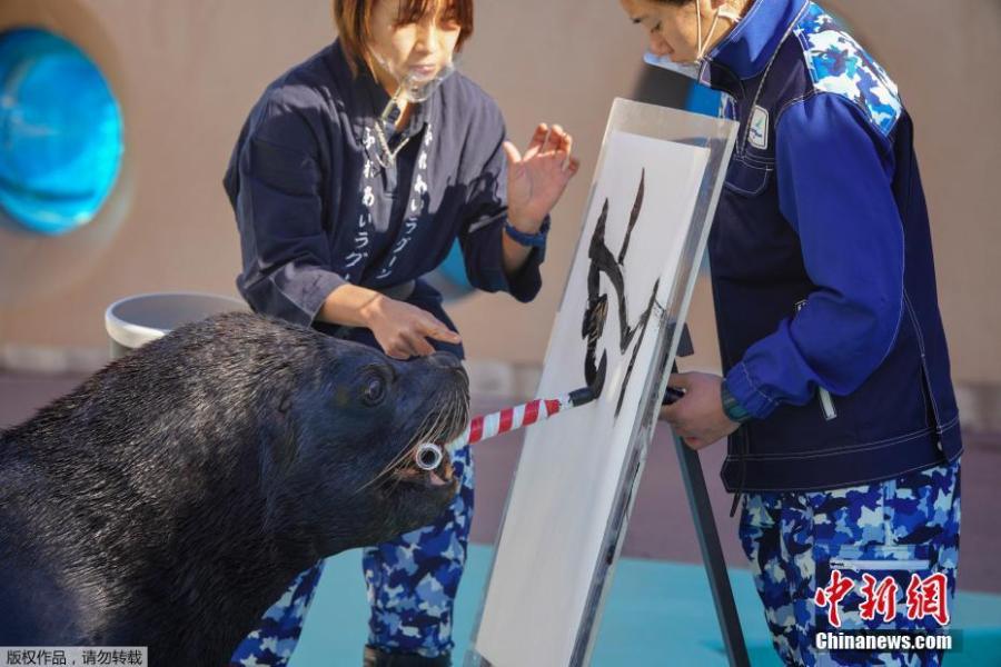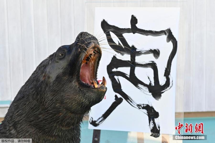 A sea lion writes the Chinese character "Yin" for the Year of the Tiger, the Chinese zodiac sign for 2022, at an aquarium in Yokohama, Japan, Dec 27, 2021. (Photo/Agencies)