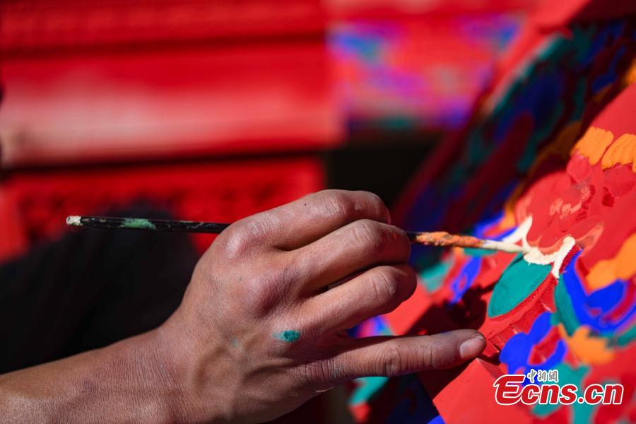 A craftsperson from a handcraft cooperative decorates a house in traditional Tibetan style in Lhasa, southwest China's Tibet Autonomous Region, Dec. 28, 2021. (Photo/China News Service)