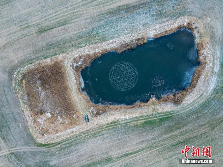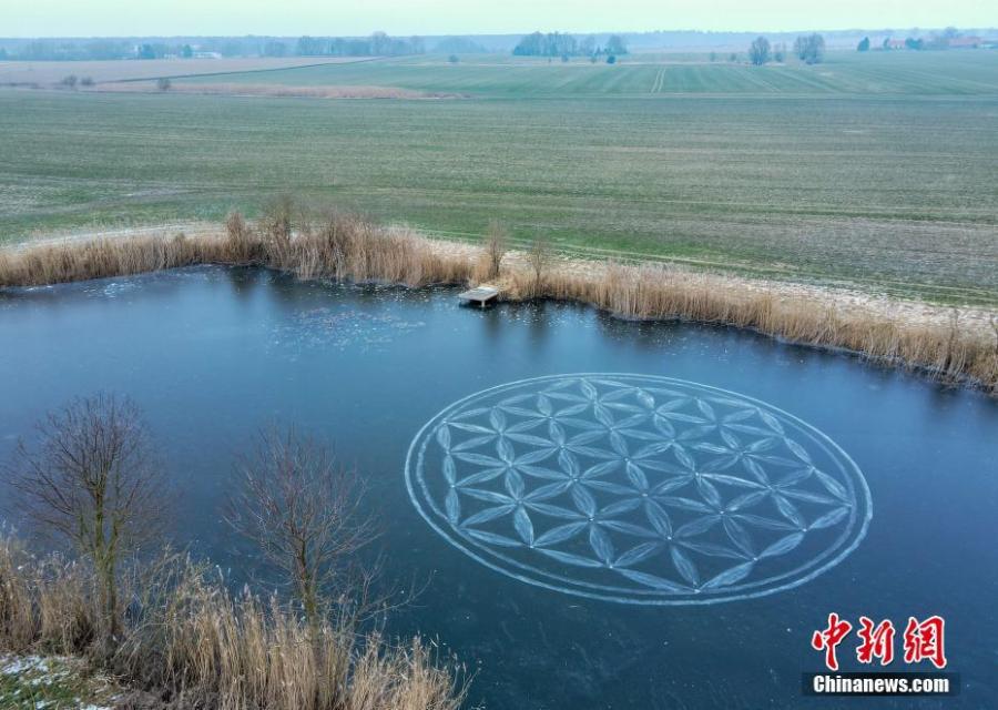 Michael Uy, a painter and artist, sweeps lines in the snow with a broom to draw the "Flower of Life" symbol on the ice of a small lake, in Jacobsdorf, Germany. (Photo/Agencies)
