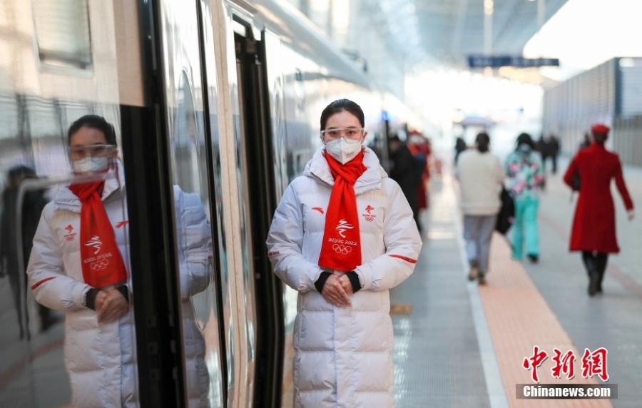 Staff wearing winter Olympic apparel dance for travelers on the G8811 high speed train bound for Taizicheng Station, Dec. 30, 2021.(China News Service/Jia Tianyong)