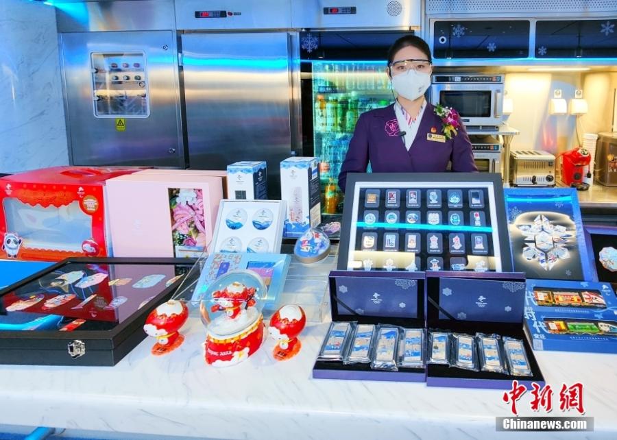 Licensed products for Beijing winter Olympics are on sale on the G8812 high speed train, Dec. 30, 2021. (China News Service/Jia Tianyong)