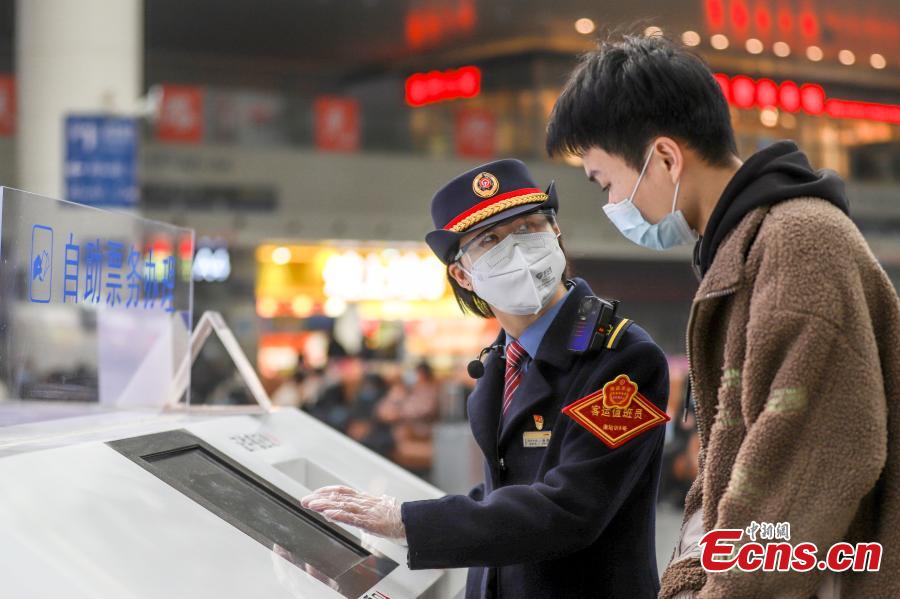 A staff member at the Nanchang Railway Station helps passengers check train information through a self-service machine, Jan. 3, 2021. (Photo by Bao Gansheng)
