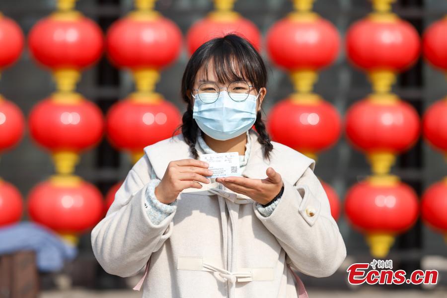A passenger shows her train tickets outside the Nanchang Railway Station in east China's Jiangxi Province, Jan. 3, 2021. (Photo by Bao Gansheng)