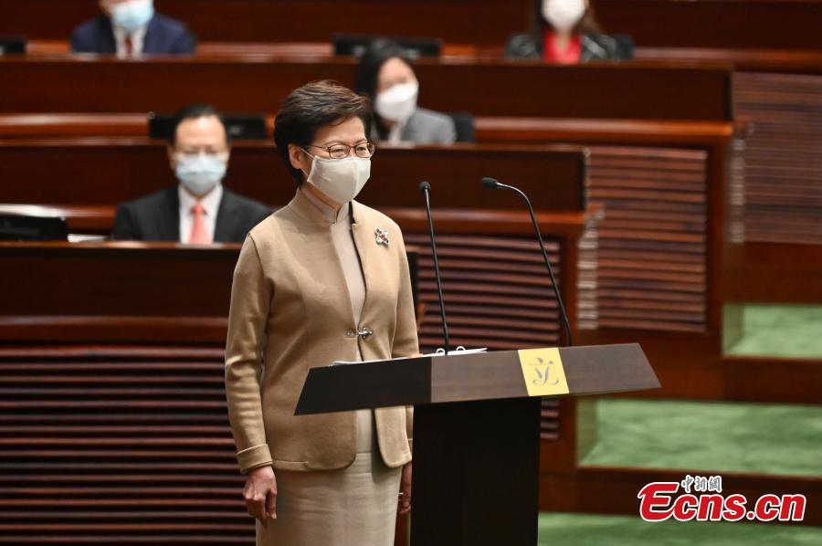 Hong Kong Chief Executive Carrie Lam Cheng, administered the oath of office, at the LegCo Complex in Hong Kong, Jan 3, 2022. (Photo: China News Service/Li Zhihua)