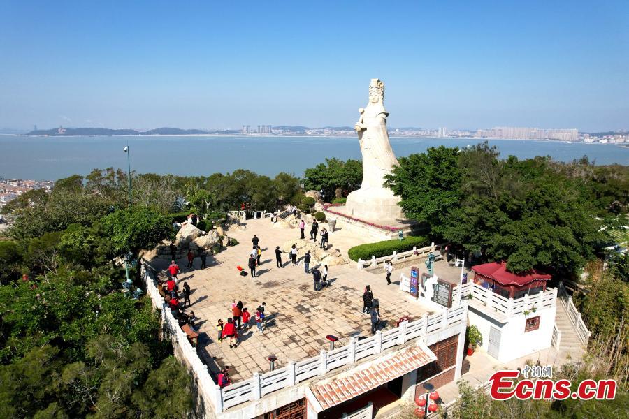 Aerial photo of a 14-meter high Mazu (China's sea goddess) statute erected on a mountain of the Meizhou Island, Putian, east China's Fujian Province, Jan. 3, 2022. (Photo: China News Service/Wang Dongming)