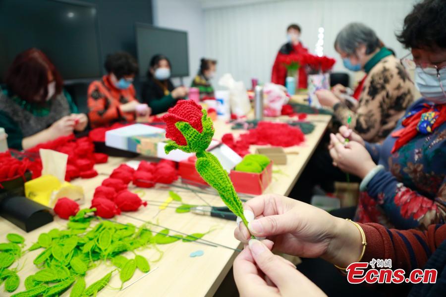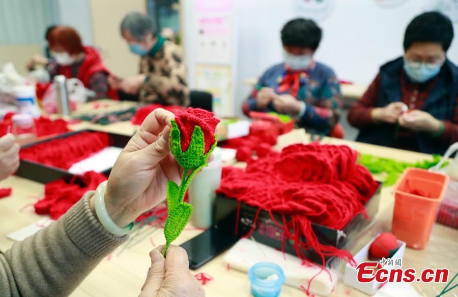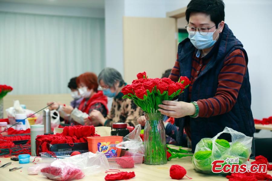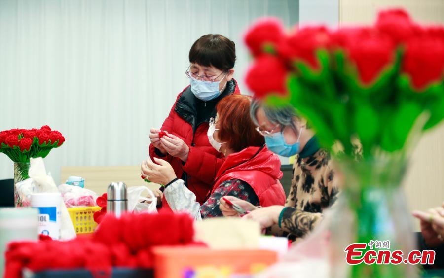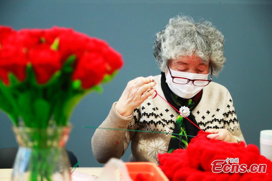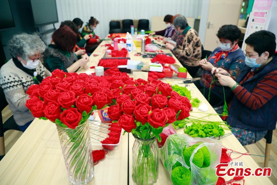 A group of aunties from Shanghai knit award winning bouquets for the 2022 Winter Olympics, Jan. 4, 2022. (Photo by Tang Junyan)