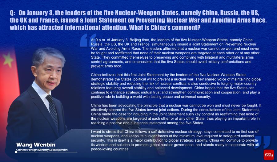 China believes that this first Joint Statement by the leaders of the five Nuclear-Weapon States demonstrates the States’ political will to prevent a nuclear war, a Chinese Foreign Ministry spokesperson said Tuesday, adding that China will continue to contribute its wisdom and proposals to global nuclear governance.