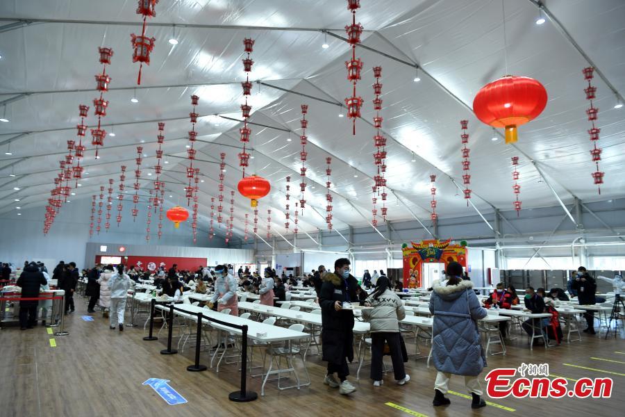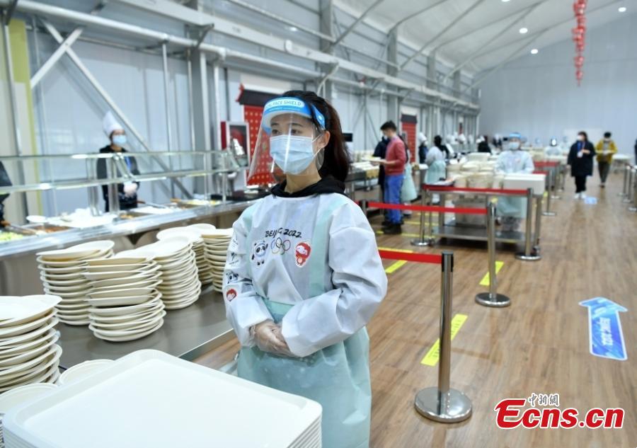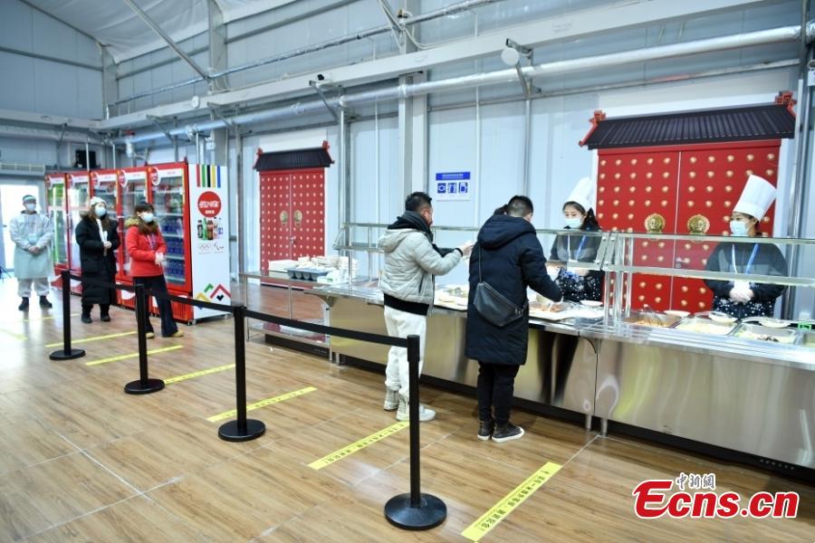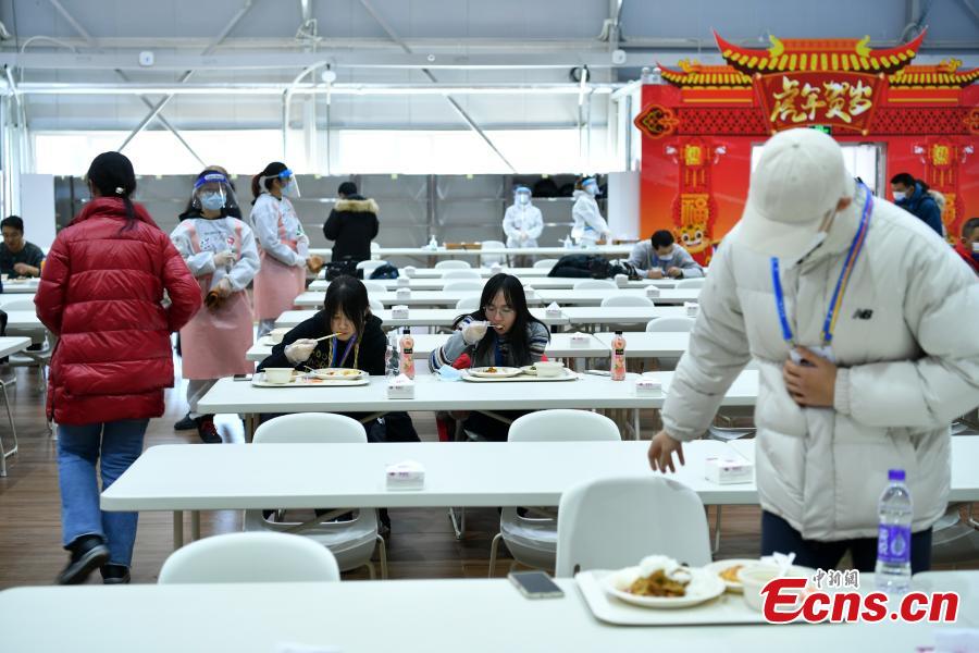 Participants of all-factor tests take a meal at the Beijing 2022 Winter Olympic and Paralympic Village at Zhangjiakou, north China‘’s Hebei Province. (Photo: China News Service/Zhai Yujia)