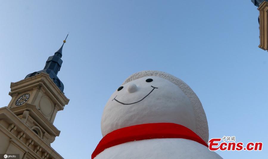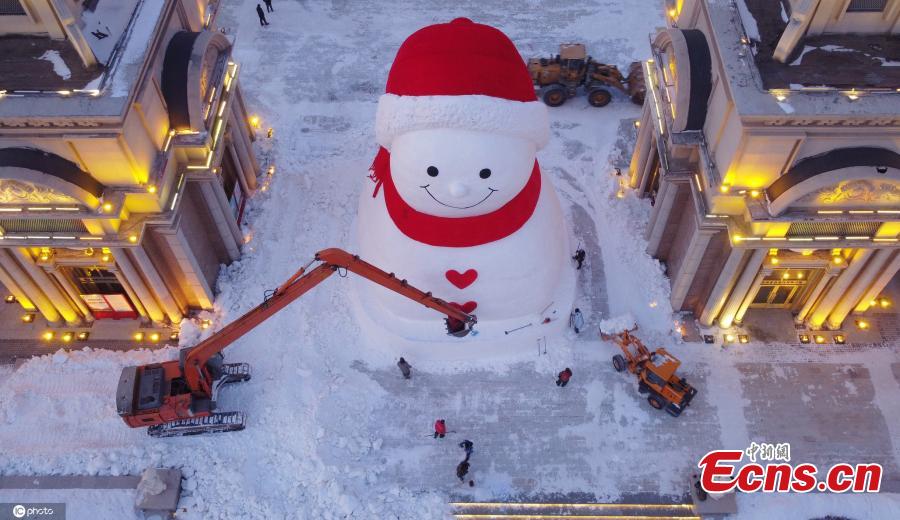 An 18.5-meter-tall snowman is created in the Music Park in Harbin, capital of northwest China’s Heilongjiang Province, Jan. 10, 2022. (Photo/IC photo)