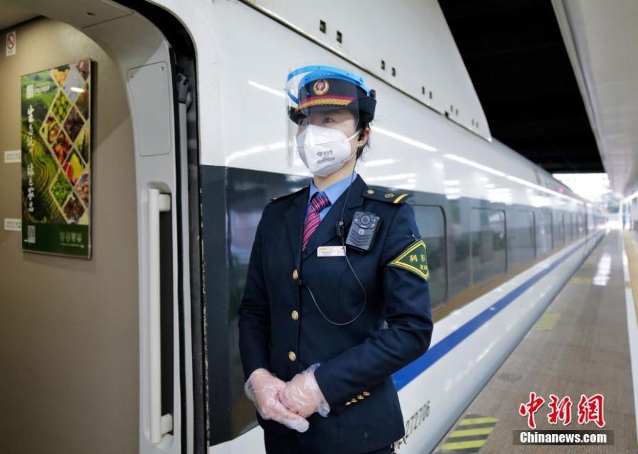 The train-crew captain waits passengers to get on the train at the door of a carriage of G2724, Shenzhen, January 10, 2022. (Photo: China News Service/Chen Wen)