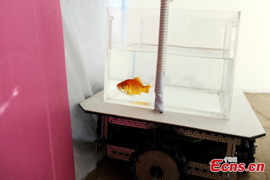 Fitted with lidar and camera, wherever the fish turns its head and starts swimming, the robotic car, or the water tank will move in the same direction.