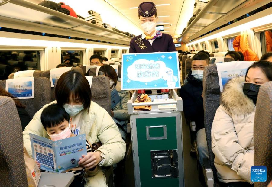 A crew member distributes epidemic prevention pamphlets on train G1724 in east China's Shanghai, Jan. 16, 2022. (Xinhua/Chen Fei)