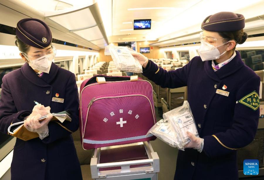 Crew members prepare epidemic prevention kits on train G1724 in east China's Shanghai, Jan. 16, 2022. (Xinhua/Chen Fei)
