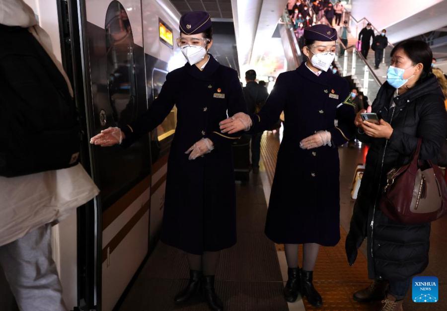 Crew members guide a passenger to board train G1724 at Shanghai Hongqiao Railway Station in east China's Shanghai, Jan. 16, 2022.(Xinhua/Chen Fei)