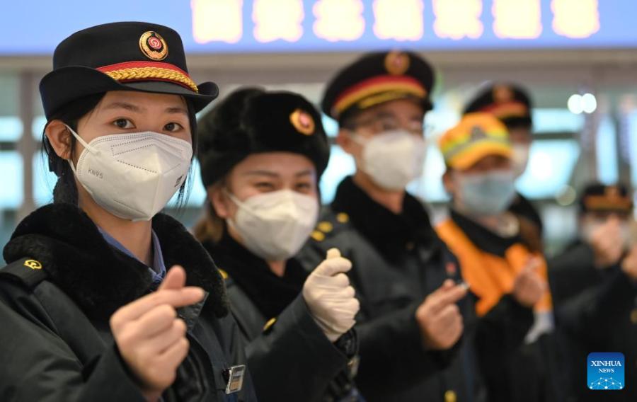 Staff members make hand heart gestures at Xi'an North Railway Station in Xi'an, northwest China's Shaanxi Province, Jan. 16, 2022.(Xinhua/Tao Ming)